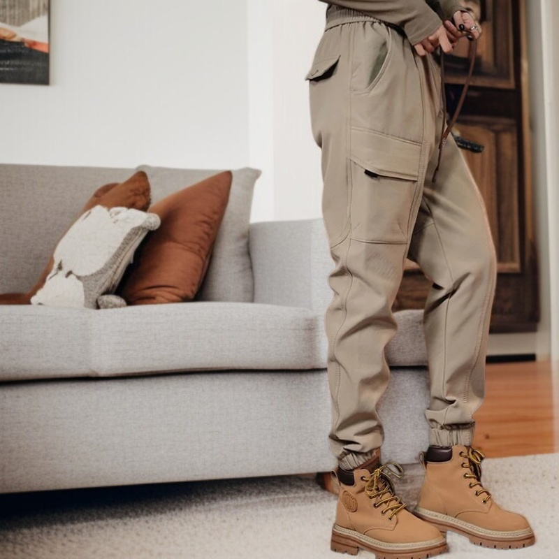 ● ゆったりとしたシルエットで動きやすく、春のお出かけや普段使いに最適なカーキワークパンツです。